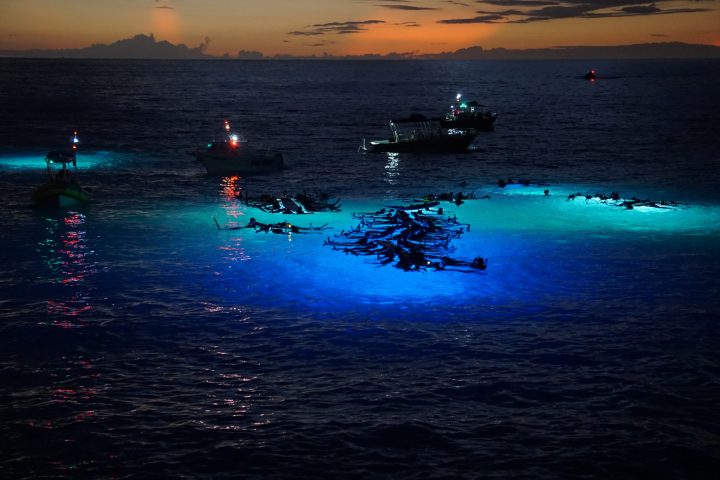 As snorkelers and divers hover near the surface, alongside their in-water guide and with the assistance of an illuminated flotation device, they are treated to an awe-inspiring ballet put on by the manta rays. The waters come alive not only due to the dance of the mantas, but the ethereal blue lights, and the gentle buzzing of plankton near the surface. The mantas gracefully glide through the calm waters of Manta Ray Village, often coming within inches of the snorkelers observing them.